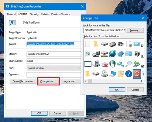 Để tránh nhầm lẫn với các tập tin khác trên màn hình desktop, bạn có thể “trang trí” lại shortcut này bằng cách nhấn phải chuột, chọn Properties. Tại thẻ Shortcut, hãy nhấn tiếp nút Change Icon.. và tìm đến biểu tượng shutdown. Cuối cùng nhấn Apply và Ok để hoàn tất.