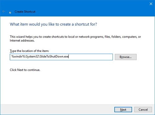 Tiếp đến, trong cửa sổ Create Shortcut, bạn hãy nhập đường dẫn %windir%\System32\SlideToShutDown.exe và nhấn Next. Sau đó, bạn có thể đặt tên bất kỳ cho shortcut này rồi nhấn Finish để hoàn tất.