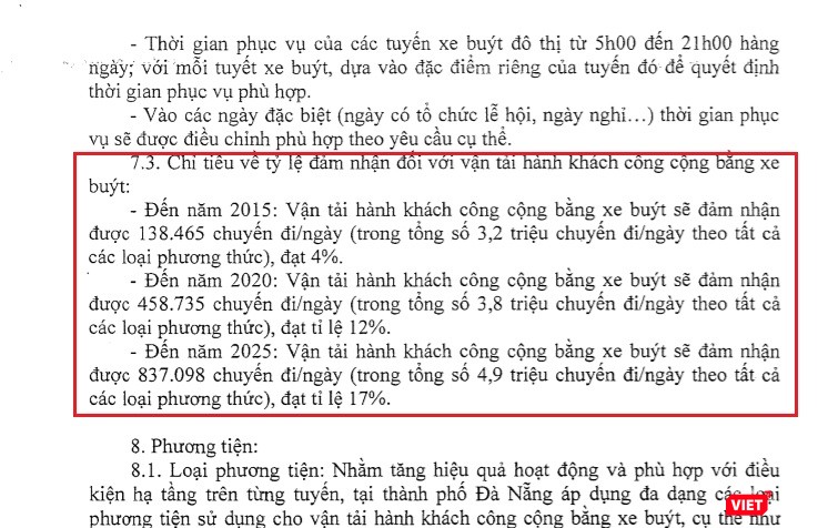 Về lộ trình, Đà Nẵng muốn tỷ lệ đảm nhận vận tải hành khách công cộng bằng xe buýt đến năm 2015 sẽ đảm nhận 138.465 chuyến đi/ngày, đến năm 2020 đảm nhận 458.735 chuyến đi/ngày và đến 2025 sẽ đảm nhận 837.098 chuyến đi/ngày.