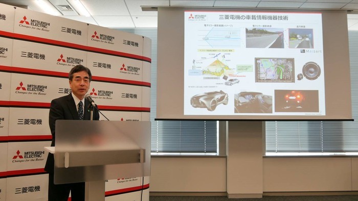 Tiến sĩ Tetsuo Nakakawaji, đứng đầu trung tâm R&D Công nghệ của Mitsubishi Electric, vừa trình diễn ý tưởng ngăn chặn tin tặc tấn công xe hơi.