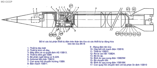 Tên lửa 8K14 được trang bị đầu đạn hạt nhân 9N33 (PA-17), 9N33-1 (PA-104, PA-104-1, RA-104-2) hoặc 8F14 (269A) đương lượng nổ lên đến 10 kT (đạn loại RDS-4), đầu đạn 8F44 nổ phá , đầu đạn hóa học 8F44G1 (khối lượng khí gas V-555kg). Trọng lượng đầu đạn nặng - 987kg.