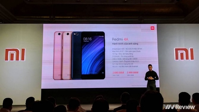 Trong khi đó, chiếc Redmi 4A có cấu hình thấp hơn với vi xử lý Snapdragon 425, màn hình 5" độ phân giải HD, pin 3120mAh, camera chính 13MP. Phiên bản RAM 2GB, ROM 16GB sẽ có giá chính thức tại Việt Nam là 2,69 triệu đồng (cao hơn khoảng 450 nghìn đồng so với bản xách tay) và được bán độc quyền trên Lazada từ 20/03. Phiên bản 2GB RAM, 32GB ROM sẽ có giá 2,99 triệu đồng sẽ được bán ra từ tháng 4 trên nhiều hệ thống bán lẻ.
