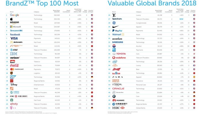 Kết quả cho ra với vị trí đầu tiên thuộc về Google với giá trị là 302,06 tỷ USD, tăng 23% so với bảng xếp hạng năm ngoái. Đứng thứ hai là Apple với giá trị chênh lệch "sát nút" 300,59 tỷ USD, tăng 28%.