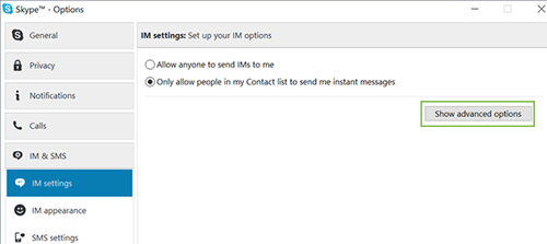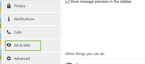 Tiếp đến, hãy truy cập thiết lập IM & SMS ở sidebar bên trái của cửa sổ Skype.
