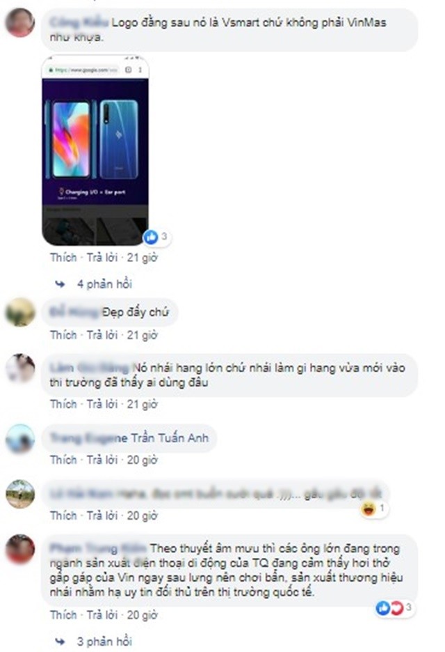 Một bình luận nhận được nhiều lượt thích cho rằng: “Các thương hiệu điện thoại trên thế giới sẽ chuyển qua OEM qua nhà máy Vsmart. Đó chắc chắn là tính toán của các các chuyên gia tư vấn khi chi phí và cuộc chiến tranh thương mại Mỹ - TQ ngày càng khốc liệt. Mình ủng hộ Vin.