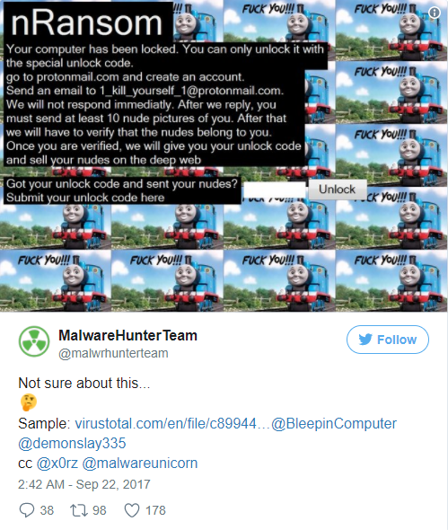 Các nhà nghiên cứu tại MalwareHunterTeam, một nhóm nghiên cứu tập trung vào mã độc tống tiền (ransomware) đã phát hiện ra phần mềm mang tên nRansomware vào ngày 21/9 vừa qua. Nhóm này cũng đã chụp lại ảnh lời "nhắn nhủ" của hacker tới những máy tính bị lây nhiễm.