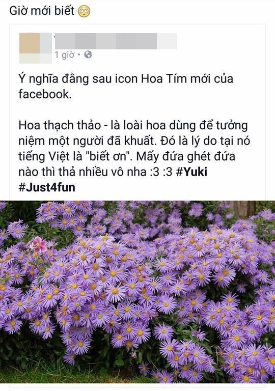 Bất ngờ xuất hiện từ ngày 12/5, biểu tượng "hoa tím" nằm trong mục Reaction bên cạnh những nút như Yêu Thích, Buồn, Phẫn Nộ,... đang tràn ngập trên mạng xã hội Facebook. Tuy nhiên có rất nhiều người sử dụng nó với lý do "thấy mới nên dùng thử", mà không biết đến ý nghĩa đằng sau hình ảnh bông hoa tím được Facebook truyền tải.