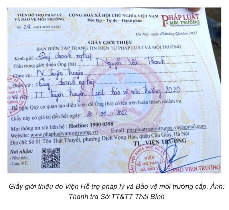 Điều đáng nói, ở phần kính gửi của giấy giới thiệu không xác định đơn vị làm việc cụ thể mà chỉ ghi chung chung là: “Quý doanh nghiệp”; chức vụ trong giấy giới thiệu là phóng viên tuyên truyền; nội dung làm việc: “TT tuyên truyền Luật Bảo vệ môi trường năm 2020” và “TT tuyên truyền bảo vệ môi trường”.