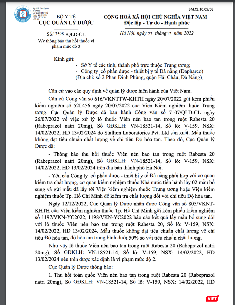 Cục Quản lý Dược quyết định thu hồi toàn quốc lô thuốc viên nén bao tan trong ruột Rabesta 20 (Rabeprazol natri 20mg) do Stallion Laboratories Pvt. Ltd sản xuất, Công ty cổ phần dược - thiết bị y tế Đà nẵng (Dapharco) nhập khẩu. Bên cạnh đó, trong vòng 2 ngày, kể từ ngày Cục Quản lý Dược ký công văn thu hồi, Công ty Cổ phần Dược - Thiết bị y tế Đà Nẵng phải phối hợp với nhà phân phối thuốc thu hồi toàn bộ lô thuốc không đạt tiêu chuẩn chất lượng nêu trên.