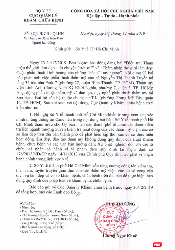 Vì thế, Cục Quản lý Khám, chữa bệnh yêu cầu Sở Y tế TP. Hồ Chí Minh khẩn trương xem xét, xác minh những thông tin được nêu về việc "bác sĩ tay ngang" phẫu thuật làm đẹp.