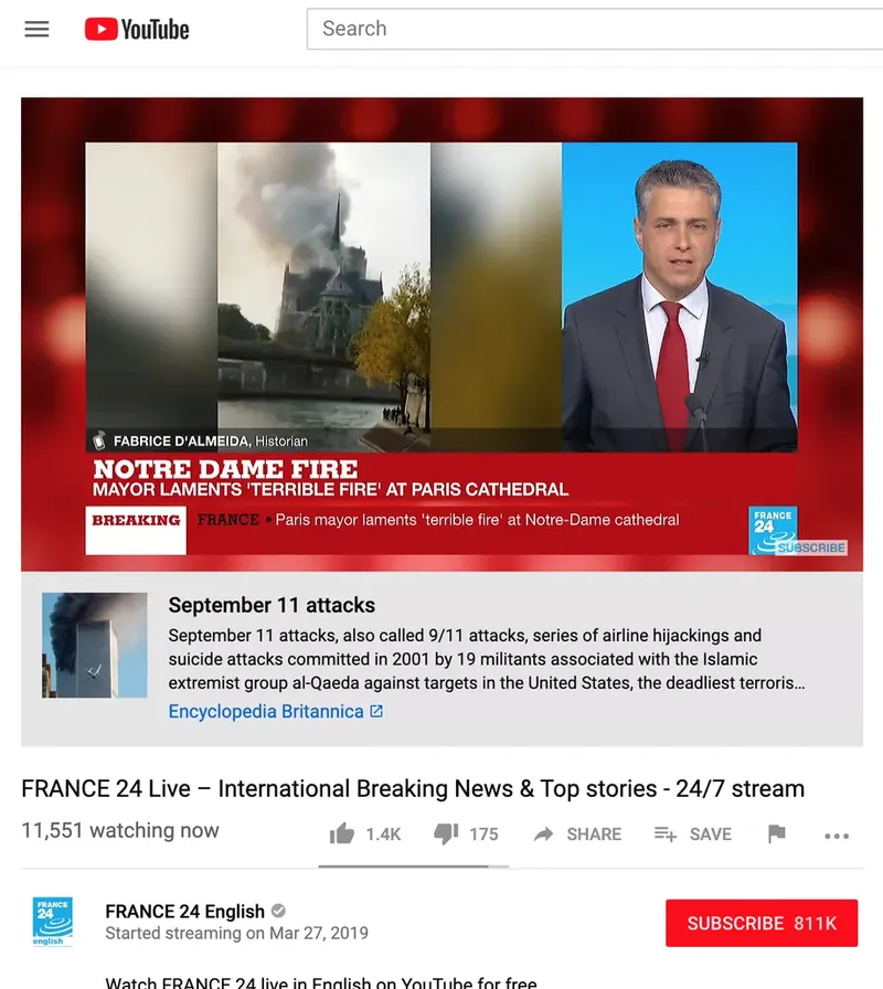 Đoạn mô tả nhỏ ở dưới video là một tính năng mà YouTube đưa vào nhằm bổ sung phần lịch sử cho một sự kiện đang xảy ra. Mục đích là để ngăn chặn những thông tin sai lệch trong các video trên nền tảng này. Phần thông tin được lấy chủ yếu từ Wikipedia và Encyclopedia. Nhưng thật kỳ lạ khi thuật toán của công ty lại liên kết vụ cháy Nhà thờ Đức Bà đến vụ khủng bố 11/9.