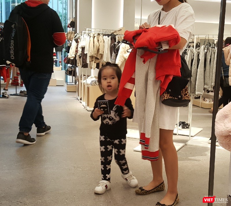 Tầng 2 là khu đồ TRF và đồ cho trẻ em. Ảnh: một khách hàng nhí được mẹ dẫn đi mua đồ.